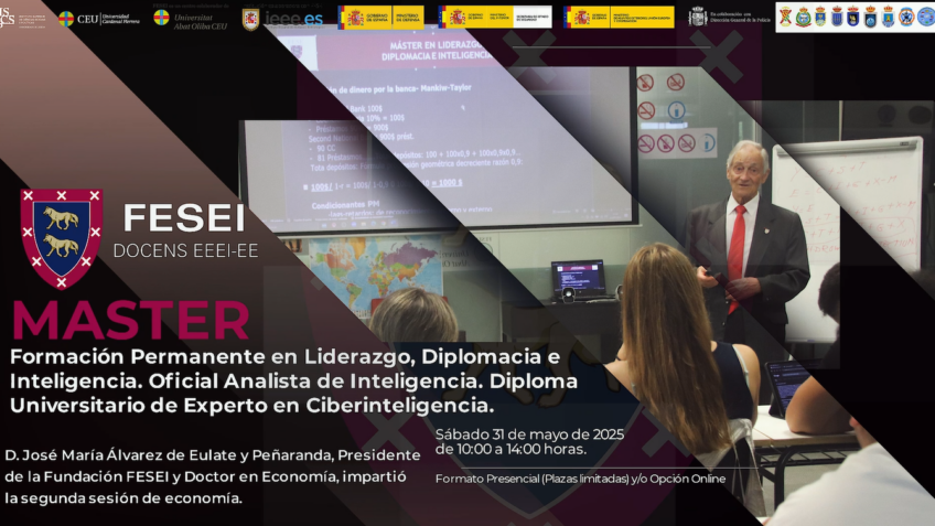 El pasado 31/5/2025, el Excmo. Sr. D. José María Álvarez de Eulate y Peñaranda, Presidente de la Fundación de Estudios Estratégicos e Internacionales (FESEI) y Doctor en Economía, impartió la segunda sesión de economía a los alumnos de la XVI Promoción.