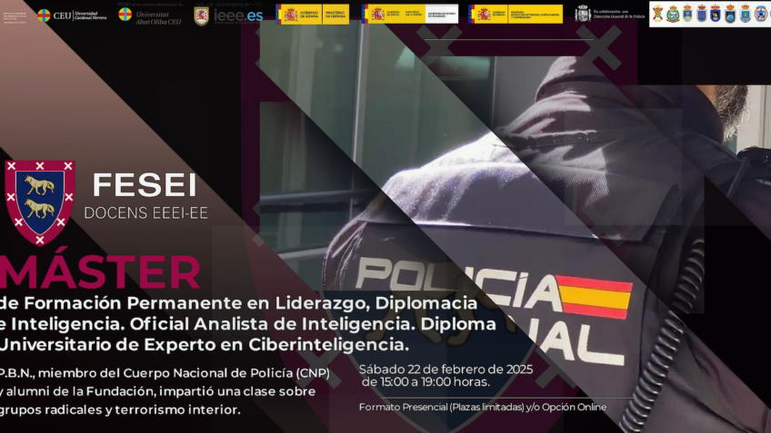 El pasado sábado 22/2/2025 los alumnos del Máster de Liderazgo, Diplomacia e Inteligencia. Oficial Analista de Inteligencia, tuvieron la sesión de Grupos Radicales impartido por el Oficial de Policía Nacional P.B.