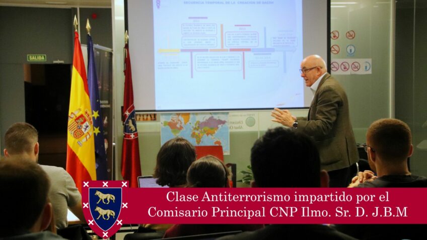 El pasado sábado 28 de febrero se llevó a cabo la primera clase del módulo de Antiterrorismo del Máster impartida por el Comisario Principal: J.M.B. Experto en la lucha antiterrorista y con una dilatada experiencia profesional en la Policía Nacional. Jefe de Grupo de Terrorismo Internacional y del Servicio de Análisis del Terrorismo Yihadista en el Centro Nacional de Coordinación Antiterrorista.