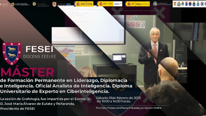 El sábado 1/2/2025 tuvo lugar la sesión de Lenguaje No Verbal para los alumnos de la XVI Promoción del Máster en Liderazgo, Diplomacia e Inteligencia, Oficial Analista de Inteligencia. Durante la clase, impartida por Excmo. Sr. D. José María Álvarez de Eulate, Presidente de FESEI, los alumnos pudieron analizar los significados de los diferentes gestos y expresiones corporales, la detección de contradicciones y mentiras. Esta habilidad tiene una aplicación práctica en diferentes ámbitos, tanto en el sector público como privado, y en la vida personal.